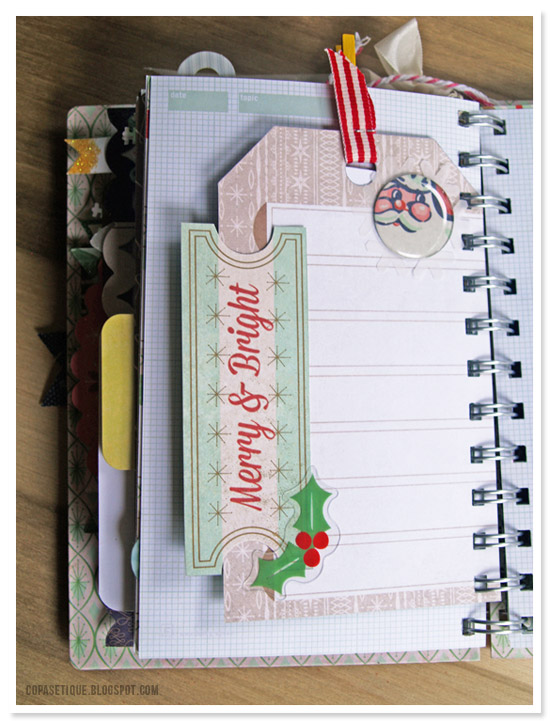 Join the 'Happy holidays' tag from the 25th & Pine die cuts pack with the pre cut page in the book by threading some red and white striped ribbon through both.