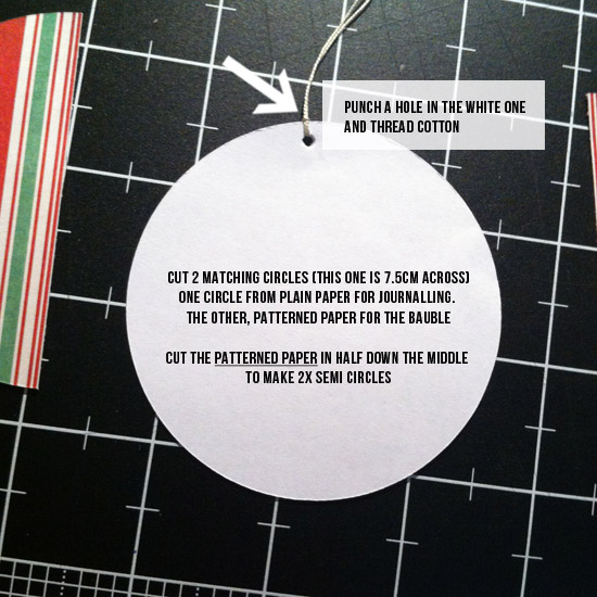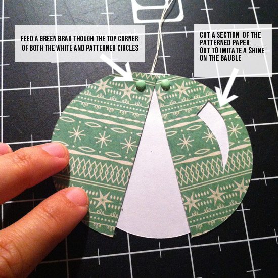 The bauble is made up of two circular shapes. One is cut from plain white paper/cardstock and the other is the same size, but from the 'Sleigh Bell Trail' paper.