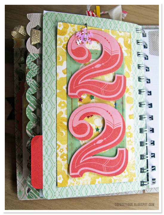 ... and opposite (for page 20, I realise I haven't placed numbers to mark the day, lol) I've used some leftovers from the vellum envelope cuts (you could use