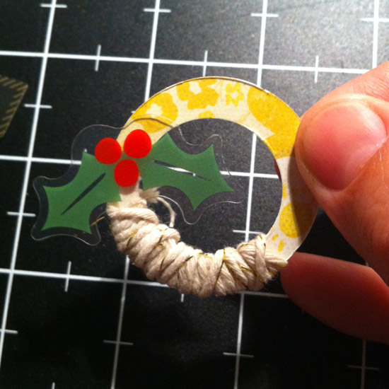Now cut out a smaller circle inside it. Thread some of the gold twine around the bottom section and tie off so that the knot is hidden once adhered to the page.