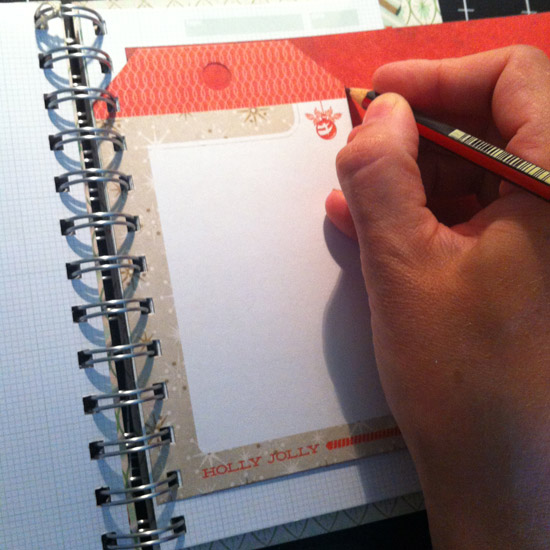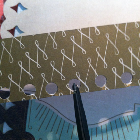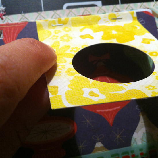 Turn the page over and place the 'season's greetings' cut from the Santa Highway cutouts on the top third. If you are going to cut the circles, the wording should peek through the circle cut.