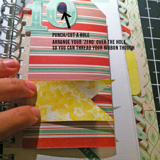 if we close the flap, this is what you should see. Arrange your numbers at the top, leaving the hole of the '0' over the punched holes, so we can thread our navy ribbon though.