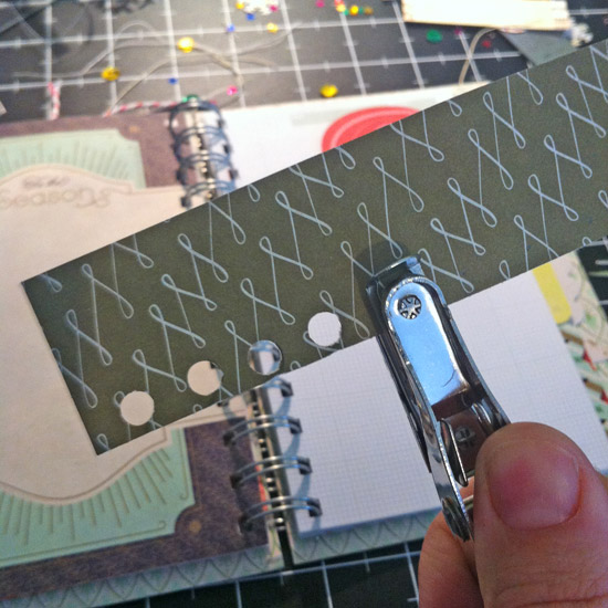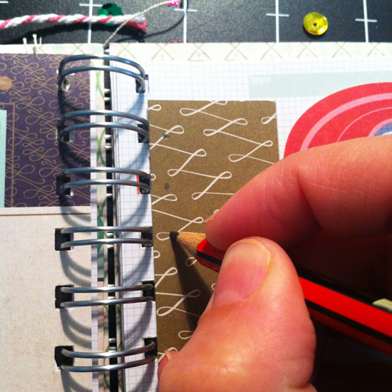 Hold it near the edges of the binding comb and make a small dot a little way away from the edge. These are marking where your punched holes will be