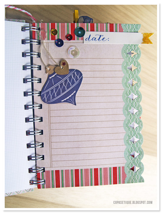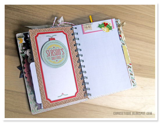 Simple embellishments using 'season's greetings' which has been cut out of the 'Santa Highway' paper and on the opposite page, an Elle's Studio snippet and a transparent holly die cut.