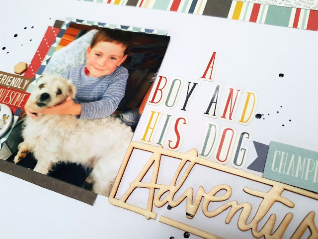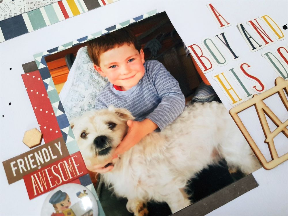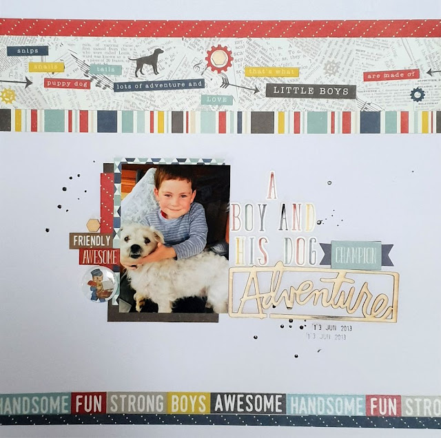 As I was getting to the last of the collection, it was a bit of a struggle to get some elements that would work together for this page. This inspiration for this page came from the quote on the paper at the top. I decided I would include a photo of my youngest son with his Grandparents dog. These 2 absolutely love each other to bits. They are both the same age and can't get enough of each other.