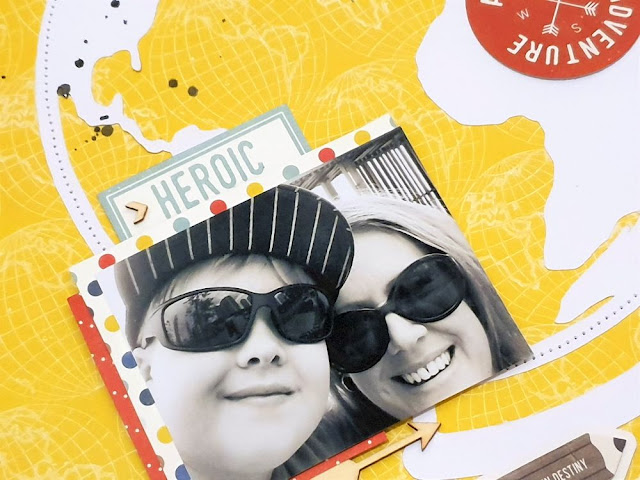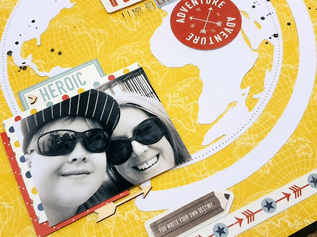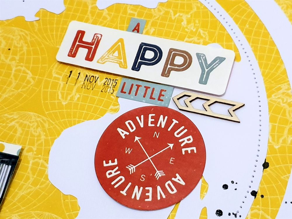 My title consists of mainly stickers from the sticker sheet and I placed on the right side of the page to balance out the bottom left size. I also added another of the wood veneer arrows next to the word 'Little'. I added one of the layered stickers down near the base of the globe design and also put one of the border strip stickers on top of the base of the globe. Lastly I added some splatters of black mist and the date stamp and that finished mt layout for this week.