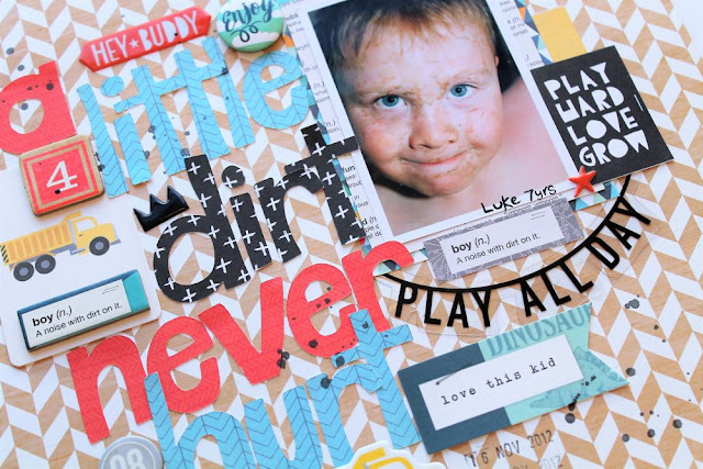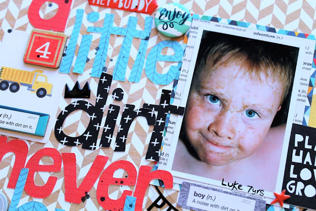 The background paper I chose for this layout reminded me of dirt tracks and so it was perfect for this layout and photo of my eldest son playing in the dirt! There were some great embellishments included in this range for me to include on this layout!