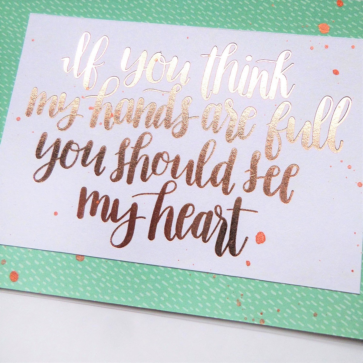 I watered down the metallic paint to add a few random paint drops by simply tapping my brush in a horizontal position over the card, and I like the way the little drops help to highlight the rose gold colour of the foiled card.