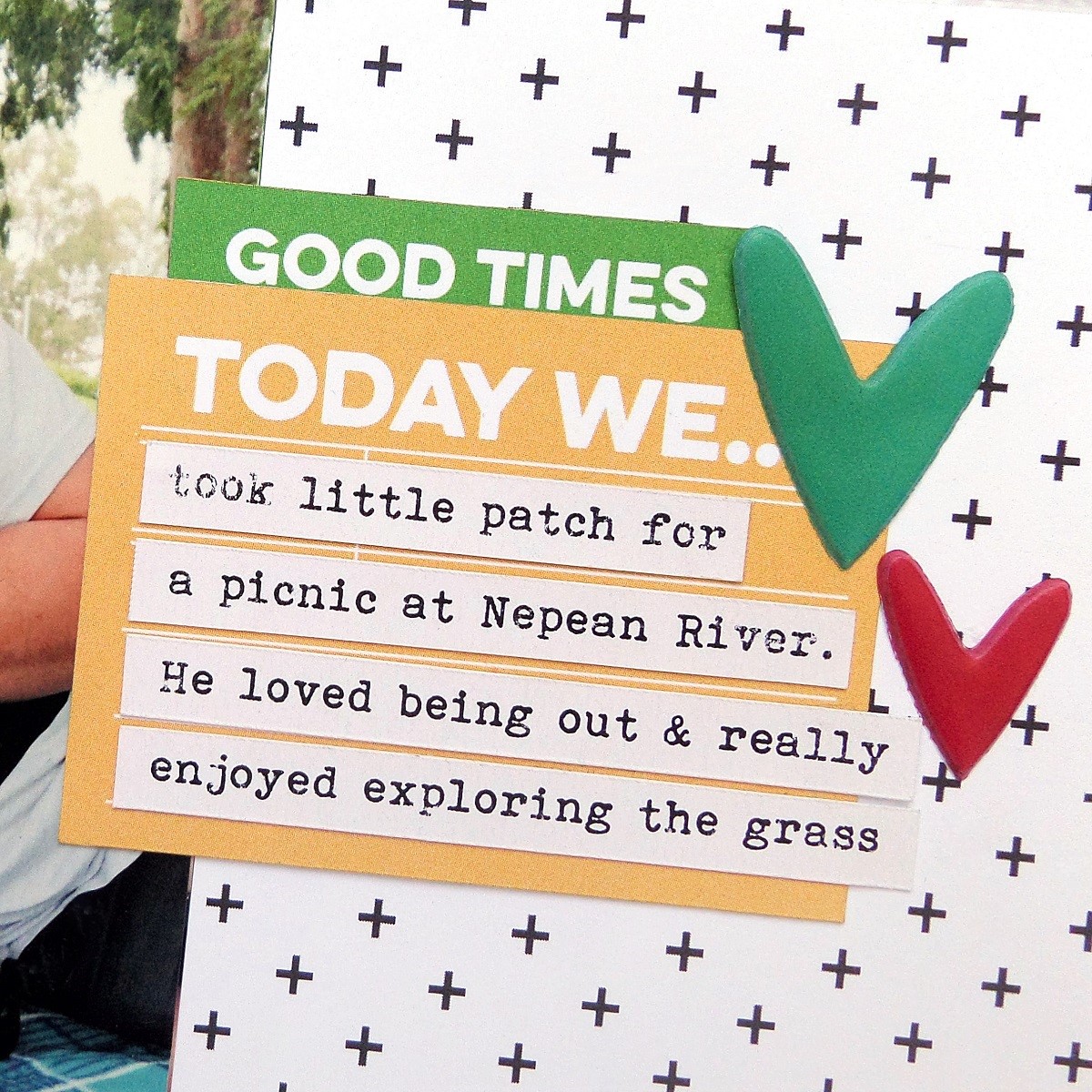 Going with printed journal strips over the cut-out and die-cut pieces to record the details of the day and finishing things off with some of the awesome puffy stickers..