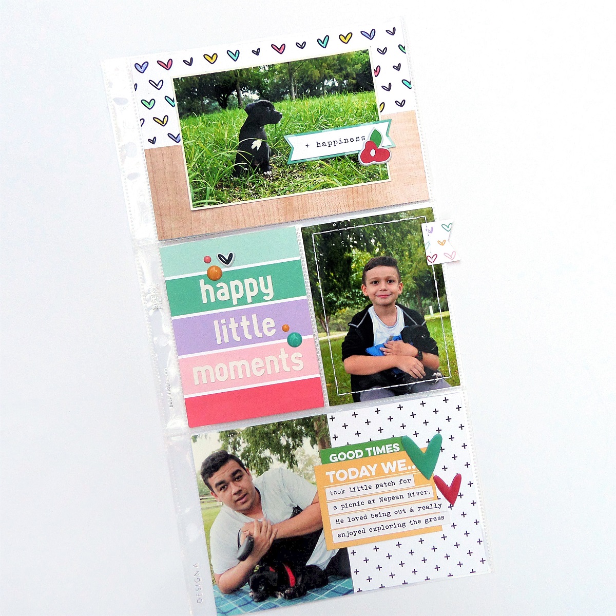 This side also shows how I used the stitched border to secure a tab to my insert. To achieve this I simple stuck two patterned paper strips to the outer edges of both photos before adding the stitched border to each pic. Once stitched, I adhered both photos and paper strips together and cut out a v shaped notch from the edge. I cut a small slit on the front side of the page protector to allow the photos and tabs to slip inside the pocket.