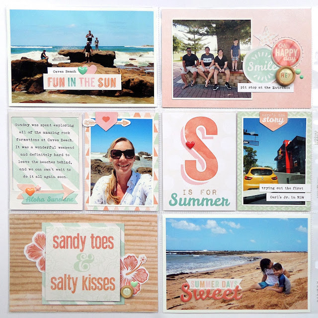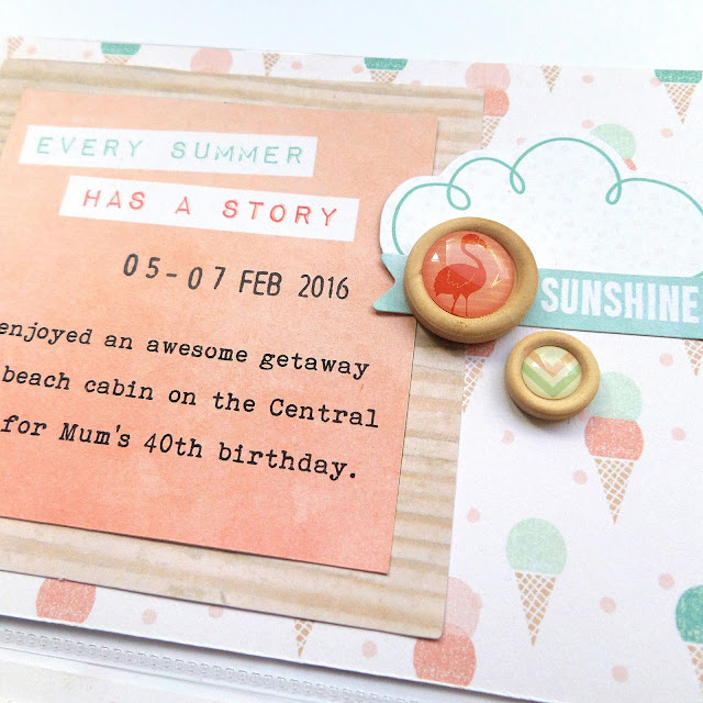 Simple paper layers and a little bit of hand stitching helps to give pockets a sense of depth, and a few clustered embellishments add an extra pop of colour. This collection has a great range of ephemera pieces and fun enamel and wooden accents that makes putting a page together a breeze.
