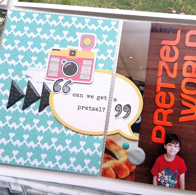I printed a little bit of journaling onto one of the die cut speech bubbles from the ephemera pack and cut it so that it joined the filler card and photo. The quotation marks from the Polaroid stamp set helped to tell the story of what my little guys asks me every time we pass Pretzel World, and the photo corners from the puffy stickers were great for pointing out what he said.