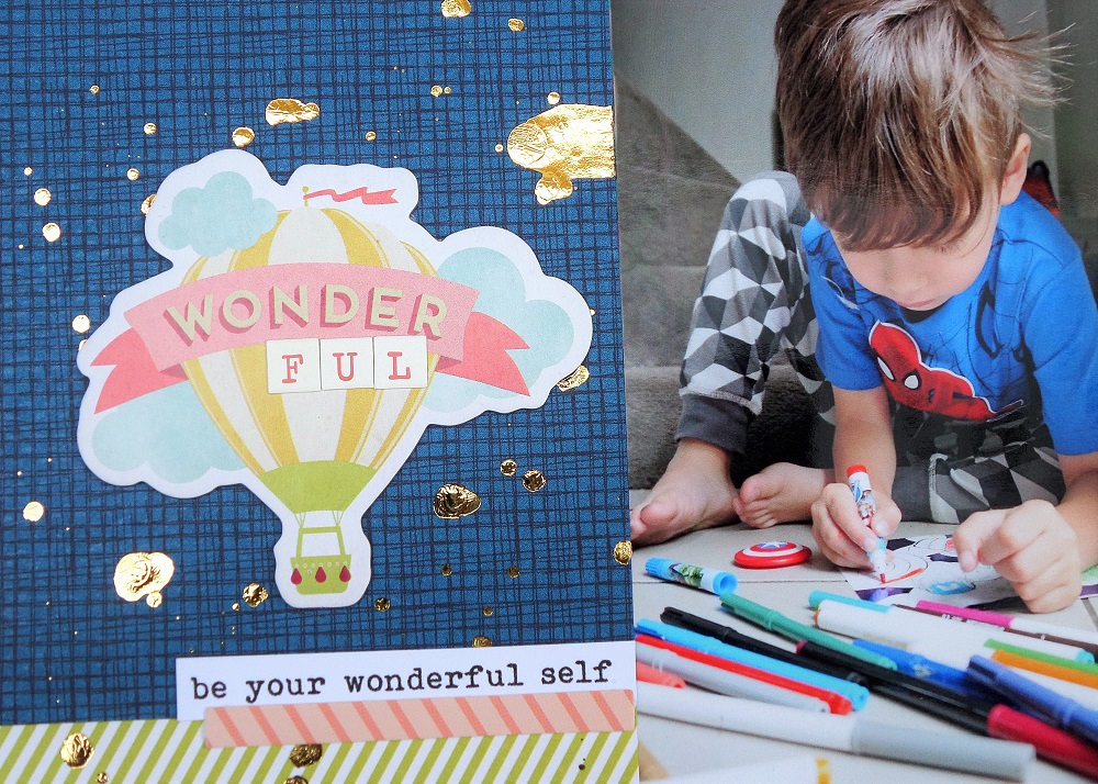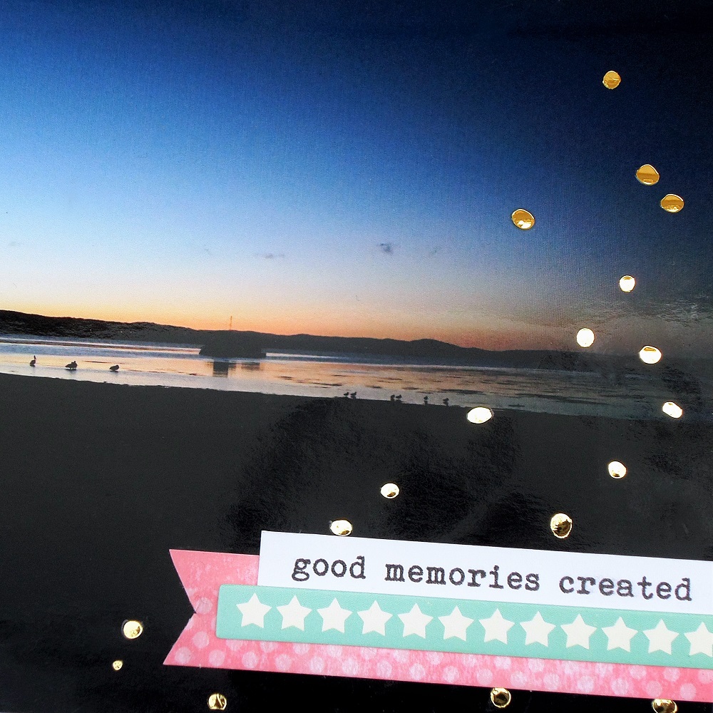 I started the month by piecing together a custom title card using some of the papers from collection and was excited to try out the new Minc Reactive Mist to add some gold foiled splatters onto the card.