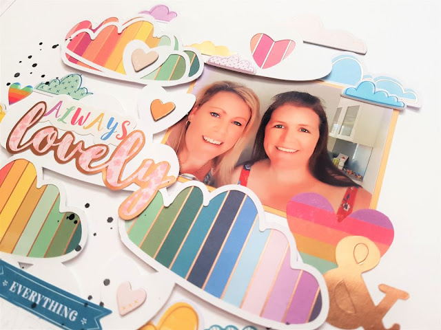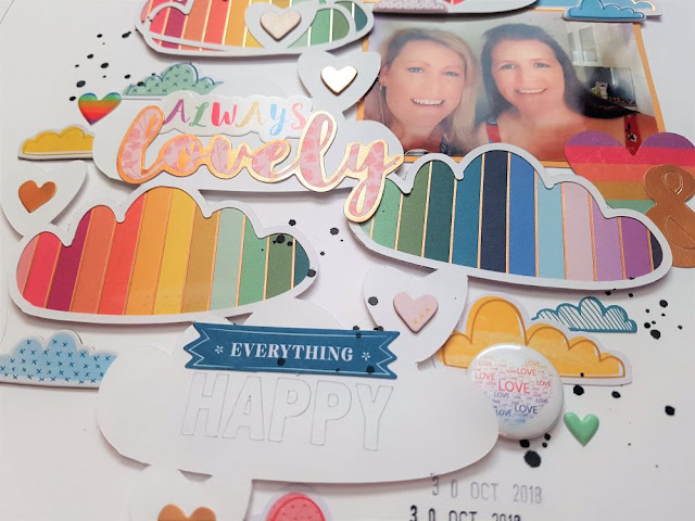 My title is made up of 2 different pieces, the Lovely die- cut word and the Always chipboard word. As well as the cloud elements, I also added a few hearts in for extra dimension and colour. I added chipboard ones, puffy ones and die-cut ones. The flair button down in the bottom area is from my stash.