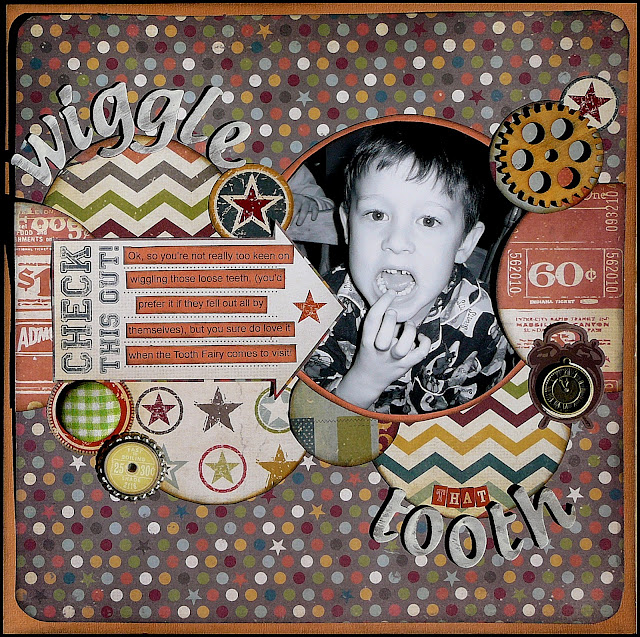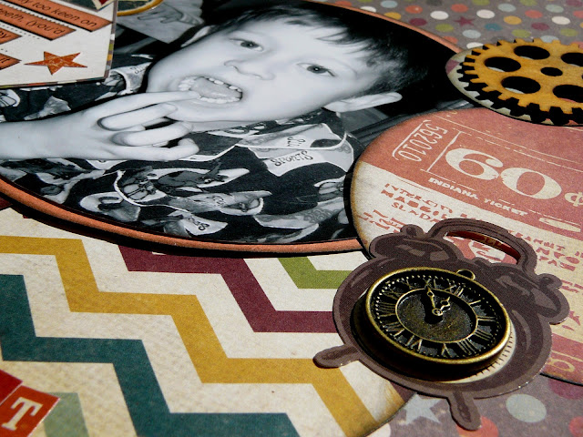 Products Used - Simple Stories Awesome 100pc Boy , Awesome Flashcards , Awesome 4x6 Journalling Cards Elements 1, Awesome Boys Rock , Awesome Expressios Cardstock Stickers , Awesome Fundamental Cardstock Stickers , Kaisercraft Wood Flourishes Cogs, American Crafts Thickers, Clock Charm, Bottle Top, Button, Paint, Ink.