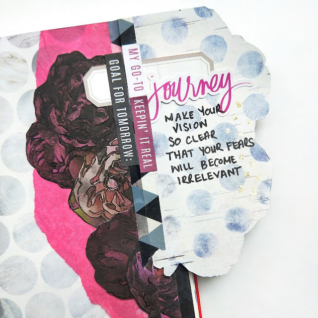 I cut out the images and attached the largest one to my paper layers with washi tape to create a tip-in to hold my journaling as an easy way to add an interactive element to my page that basically consists of a strip of washi tape on two sides of your added items to form a hinge that allows you to view both sides of the item you have added.