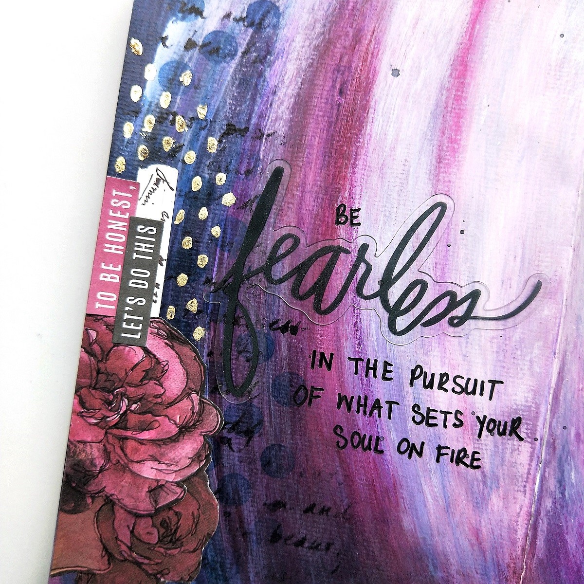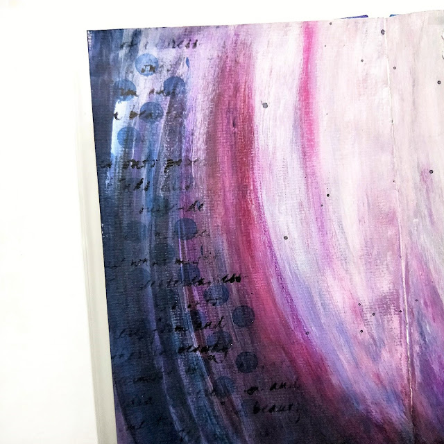 I then applied some detail with a couple of background stamps along the left hand edge of the page, and flicked on some droplets of distress ink then allowed this to dry before using more gel medium to attach my paper layers to the page along with one of the acetate words used to complete a hand written quote.