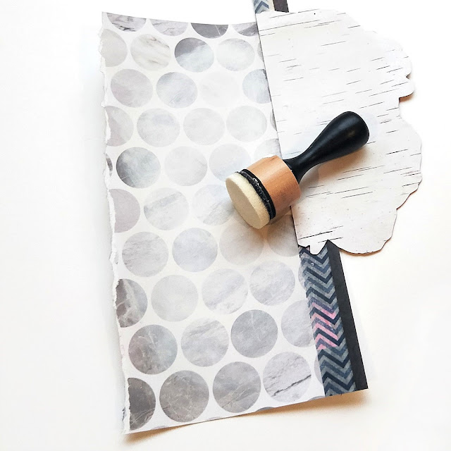 Making off the manufacture's strips with more washi, I used a blending tool to apply a thin coat of gesso over the patterned paper - be sure to keep in mind that patterned paper does not do well with a lot of moisture so be sure to keep all of your paint layers on these pieces fairly light.