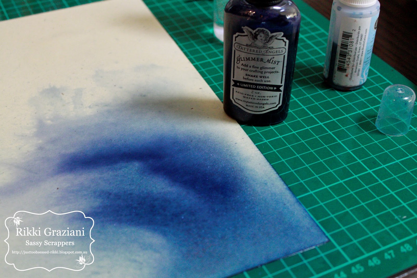 To start off this technique wet your cutting mat with a mister bottle full of water, then wet the back of your cardstock and sit it on your wet mat trying to make sure its flat, then mist the front of the cardstock and be very generous as you want the glimmer mist to pool and pull around your page. By doing this it will eliminate all the harsh lines you get from your mister and it gives you time to blend colours and it will also stop the cardstock buckling.