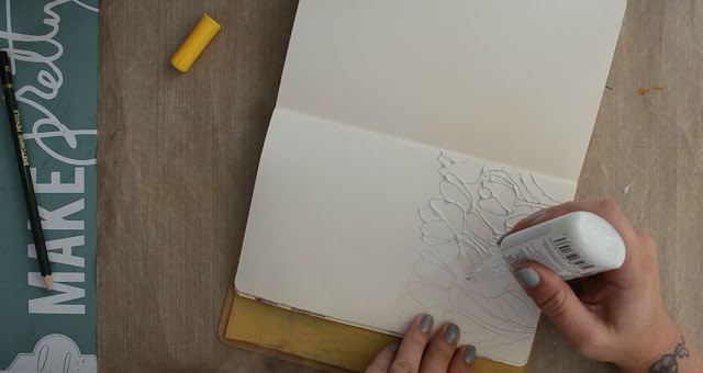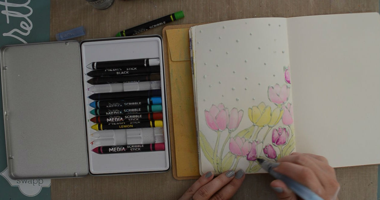 So the next thing I did once my resist pen was dry was to use the Dina Wakley Scribble Sticks to colour in my tulips. The colours I used were - Magenta, Lemon, Lime, Sky, Night, Tangerine and Blackberry. I used my water pen to take the pigment from the stick and used them as a watercolour medium.
