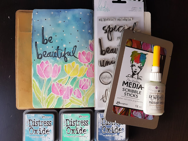 - Tags: Art Journal, Distress Oxide Ink, Farrel Tailor, prima watercolor resist pen, Sassy Scrappers, scribble sticks