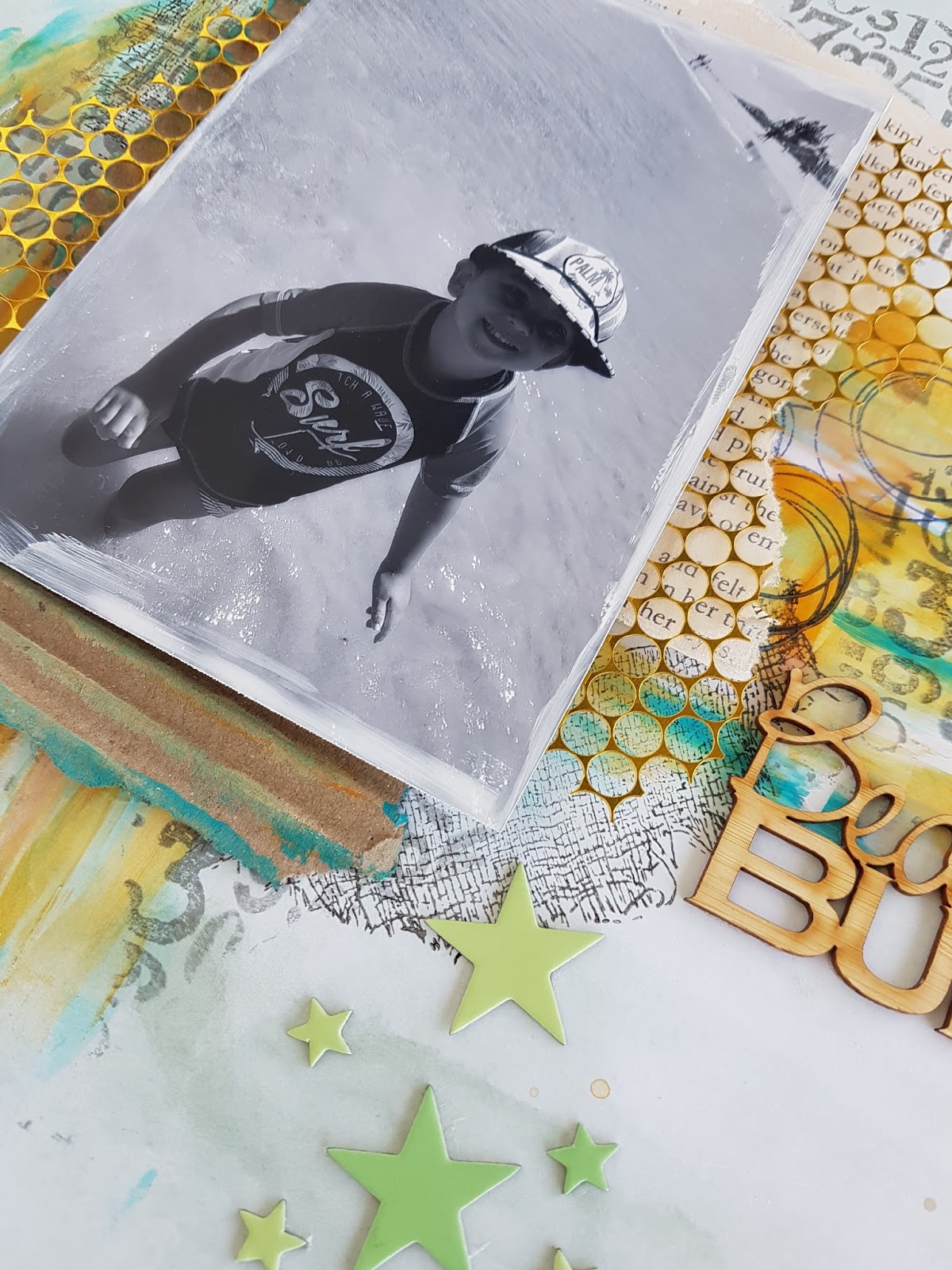 I have used a hessian and twine stamp I had in my stash along with this chipboard title. The gold honeycomb strip was also something I had packed with me for the trip and was glad I did.