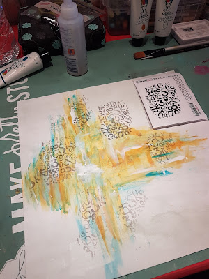 So the first thing I did was apply a thin coat of gel medium all over my Heidi Swapp Magnolia Jane 12x12 paper - Vintage Market. I used gel medium so that I would have time to move my paints around on the page before they started to dry.
