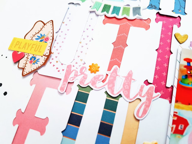 I have had this gorgeous photo of my niece printed out for a little while, in this photo she is about 8 months old and she is almost 2 now! I just love this photo and it was the perfect one to use with the Whimsical collection and cut file. I chose a large cut file title this week, I cut the title out on white cardstock and then used the Whimsical 6' x 6' paper pad to back all the letters. I used lots of the different patterns and colours.