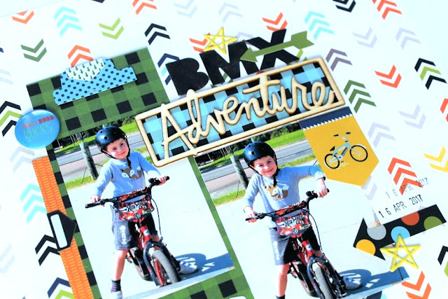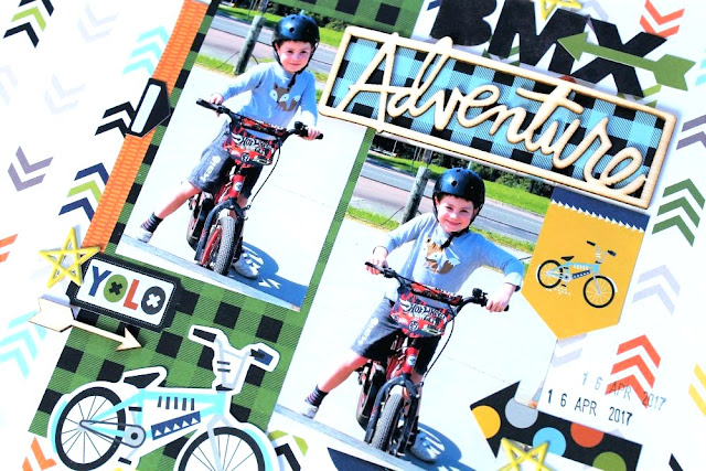 The background arrow paper was the perfect paper to use with these photos, I like how the paper shows movement with the arrows directed up and down. The BMX word are the Alex sticker alphabet that I coloured black as the grey would have been lost into the background paper otherwise.