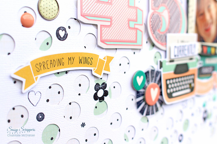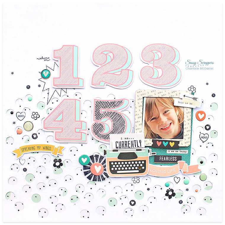 This next page uses these gorgeous Heidi Swapp numbers which are too perfectly coordinated with 'I AM' to pass up. The spotty cut file is from JustNick and it was actually a test page which I had cut and kept aside. Layering it over the Maggie Holmes Confetti paper had such a playful feeling, with the little stamps and small elements, it was perfect for capturing my very cheeky five year old!