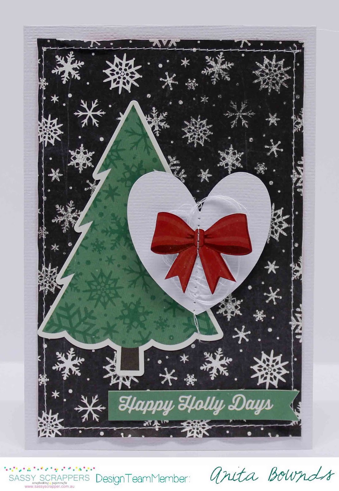 With this card I used the Ornaments Paper cutting it so I had a border and then machine stitching a border then I added a tree sticker and a little happy holly days banner sentiment a little cut cardstock heart with cotton thread and machine stitched the little red bow to the heart