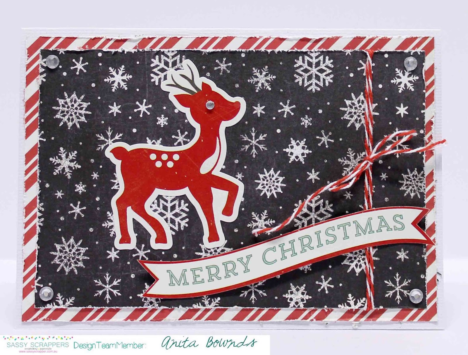 Leaving a border around the edge and I repeated the same with the Christmas Cheer Christmas Ornaments Paper leaving a part unglued to wrap some twine around a few times and added a little twine bow then I glued it down and added the cute little deer and the merry Christmas banner sticker