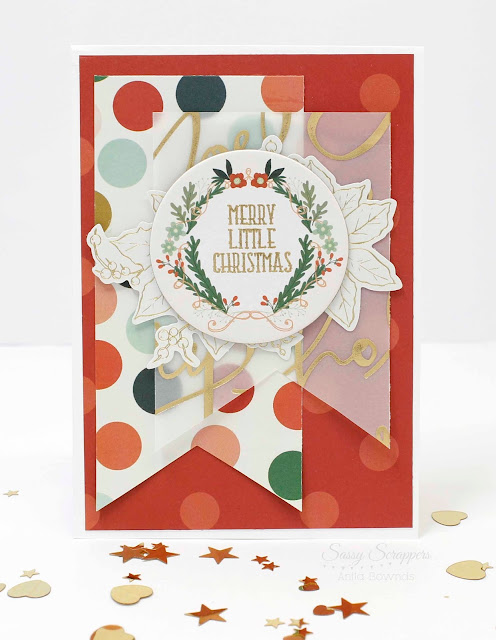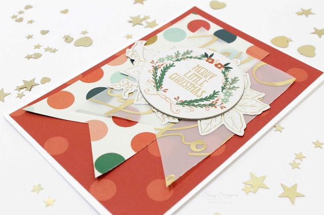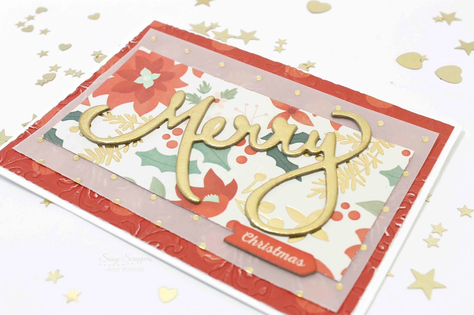I layered the red polka dot paper over the my card base after embossing it with a embossing folder