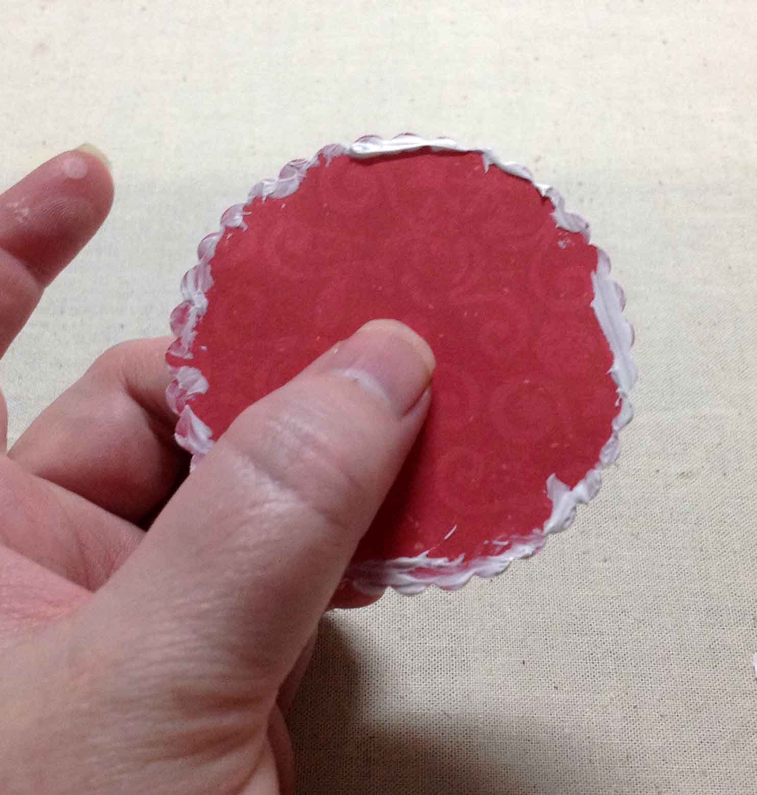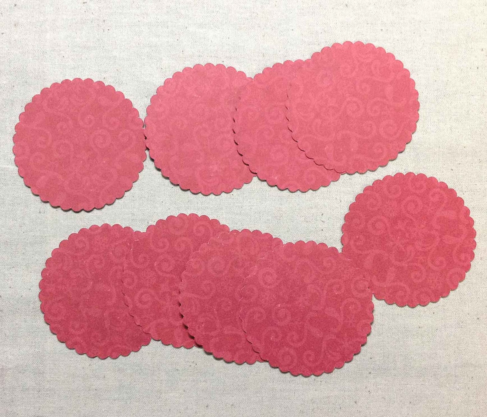 Next I cut 9 2 1/2inch scalloped circles of patterned paper with my silhouette cameo