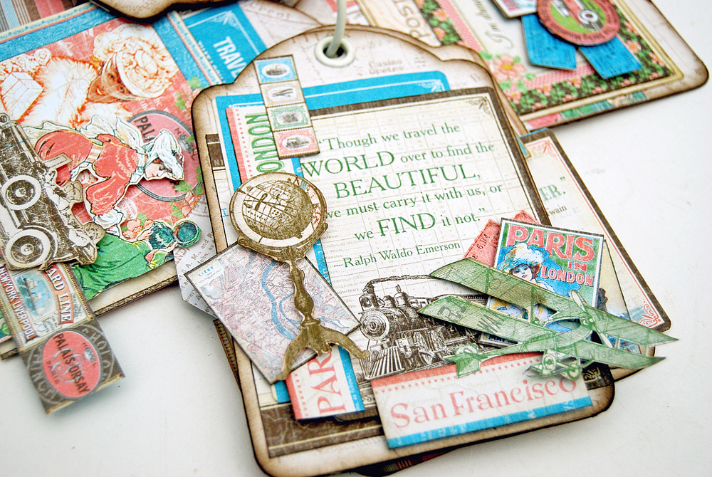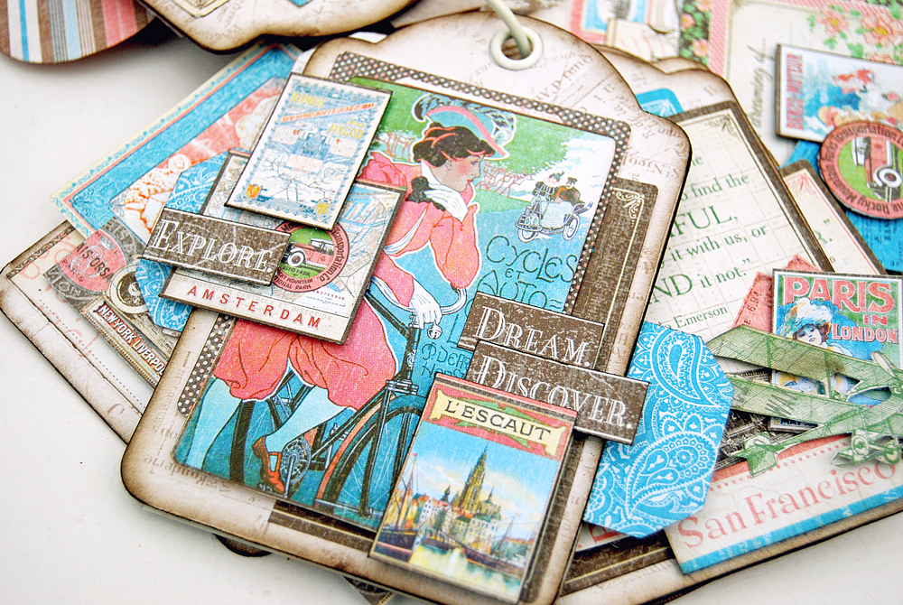 I was able to add embellishing detail to each of the tags by layering Journaling and Ephemera Cards, fussy cut elements and coordinating chipboard.