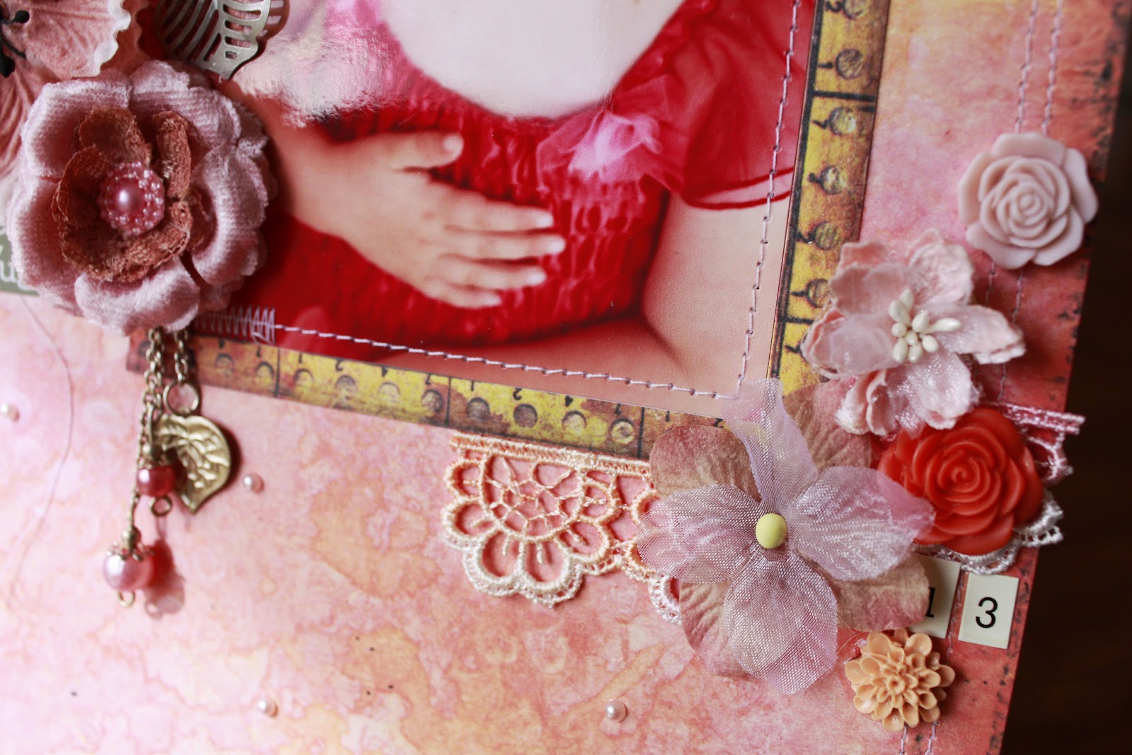 The sewing machine is a great way to add interest and unity in all your pieces of background papers, it helps tie in all the layers. Also keep your scraps, they can make a nice photo corner.