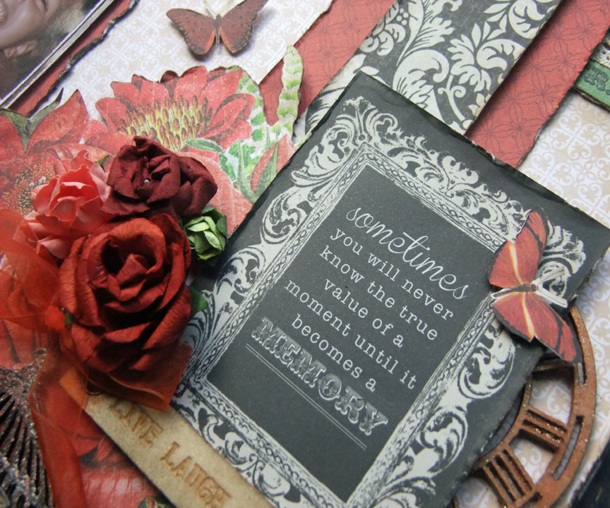 To alter the wooden bird cage flourish stamp a background using clear ink & clear embossing powder. Set the embossing powder with a heat gun. Spray Heidi Swapp Color Shine in Black Velvet & Georgia Peach. Set with a heat gun again