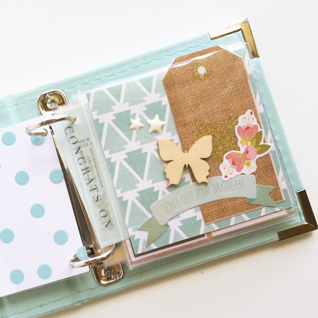 In the next pocket, I wanted to embellish with a few simple elements from the Hello Gorgeous mixed elements bag! I've also added a Jillibean Soup wood veneer butterfly and some Bella Blvd enamel stars from my stash. The tag is from another coordinating Maggie Holmes collection.