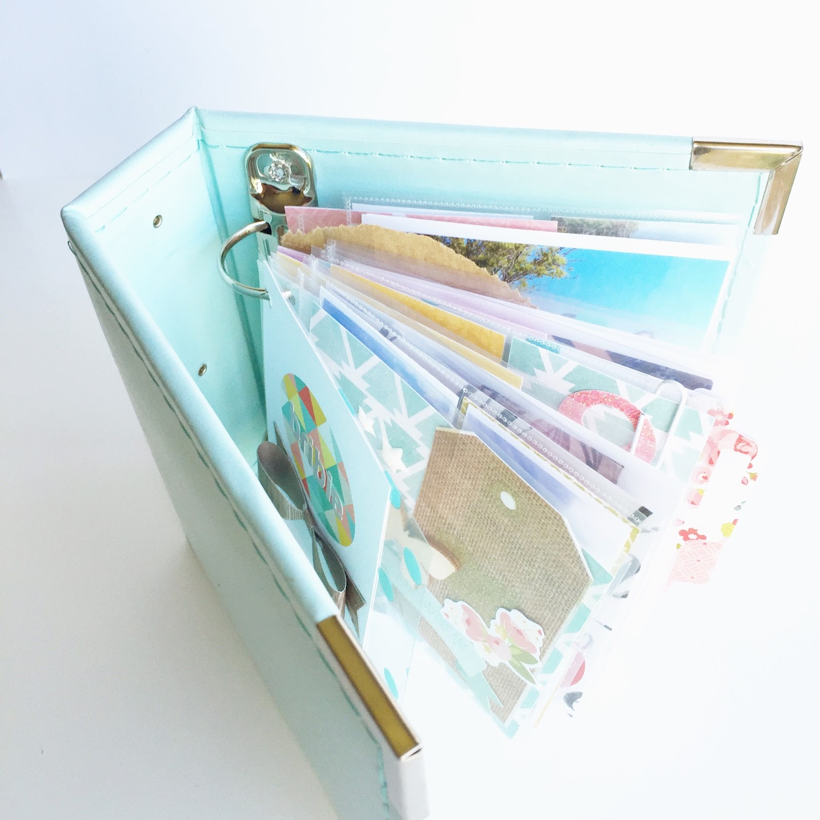 Between the photo pocket refills, I've added substance to the pages by trimming a 12x12 Bella Blvd transparency and inserting them randomly. To allow the transparency to fit neatly, line up one of the album pockets with the 4x4 transparency and with a hole punch, carefully punch the holes to slip onto the ring binder.