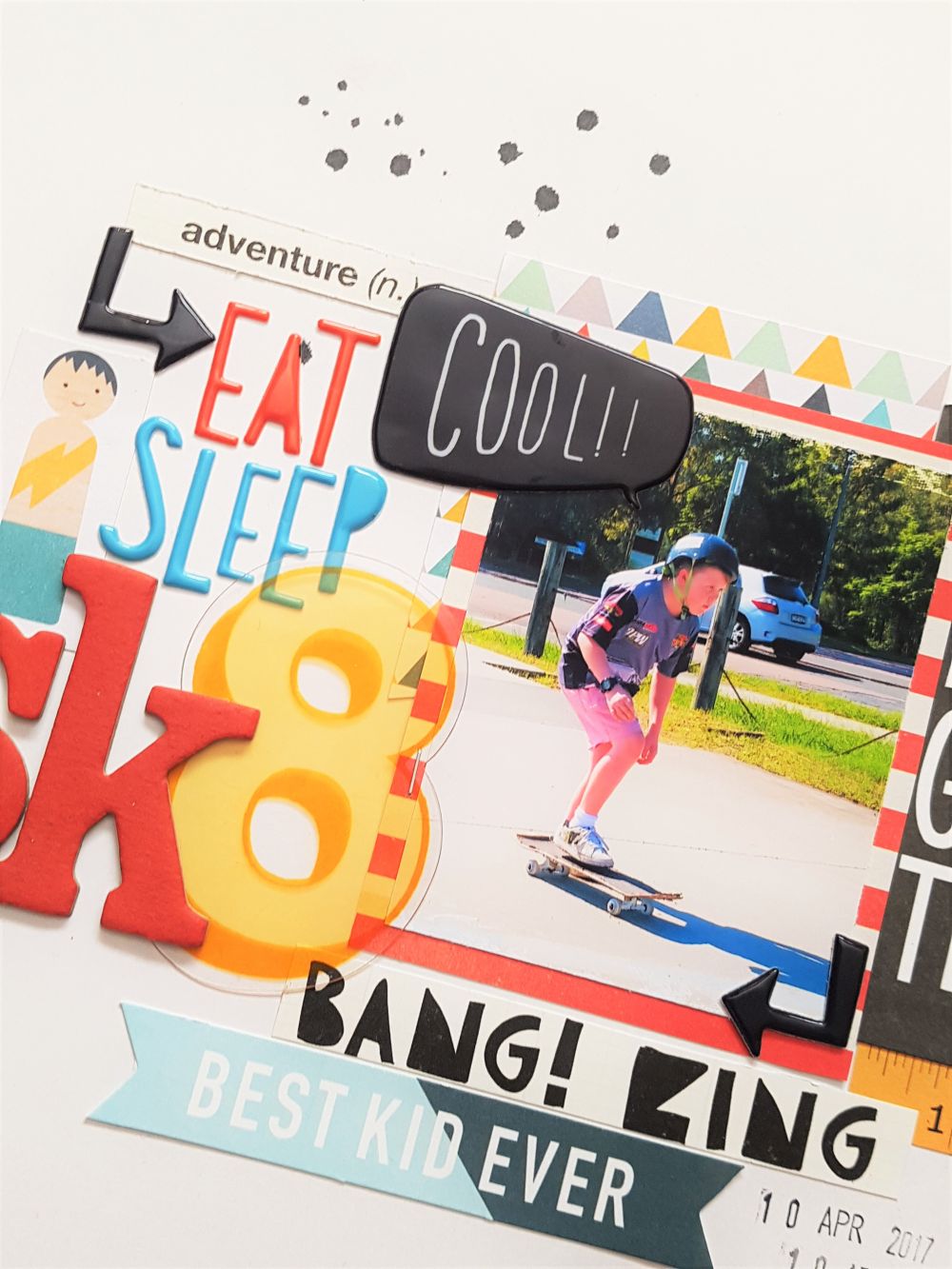 I used up some of the Cool Kid puffy stickers as part of my title and for some embellishing as well. The Bang! Zing strip of paper is from one of the patterned papers....I had to add it as my son has had a few stacks on his skateboard so the Bang was very appropriate!