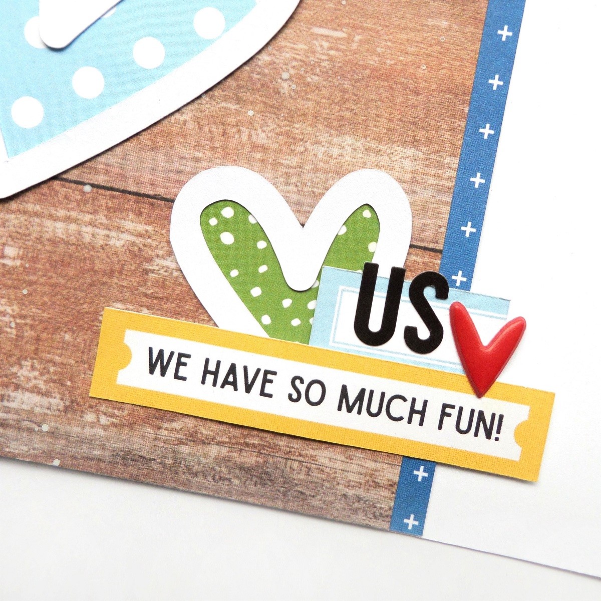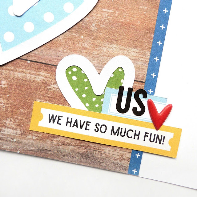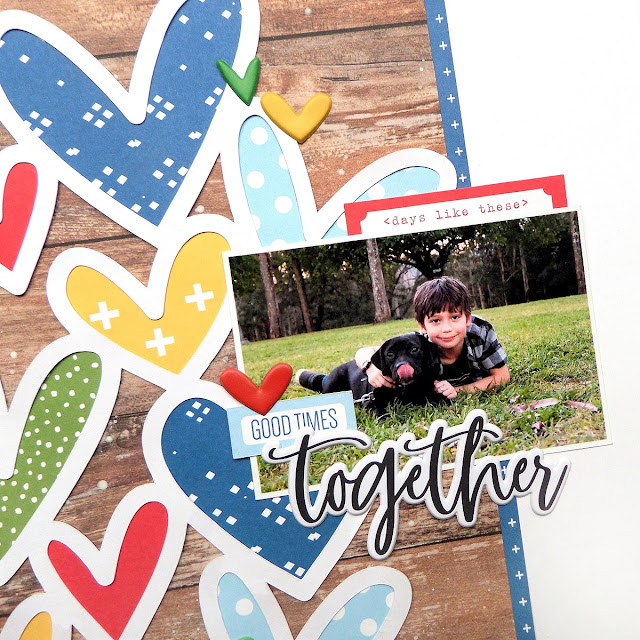 I used a few small tags from the cut out sheets along with a title from the puffy stickers to frame my photo and just like with my pocket pages, I often look for an element that will help tie my design together... in this case it's the white borders around the cut file hearts that work with the plain white background and I also like how the borders also help to make all the colours pop against the woodgrain pattern.