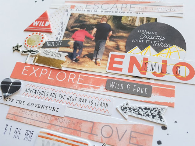 The inspiration for my layout today came about from my son's red jumper in the photo! Plus both my sons are going on a bushwalk so it was the perfect photo to team up with this collection! I flipped through the 6 x 6 paper pad and ripped out the red paper with all the quotes on it. I loved that I could cut them into strips and adhere them above and below my photo.