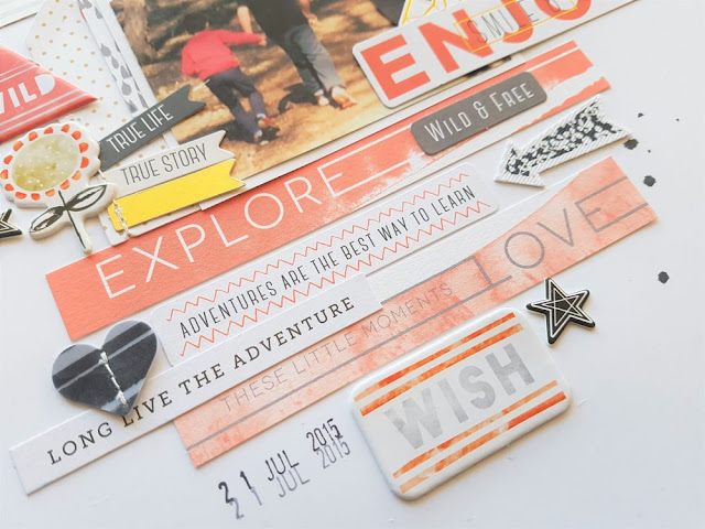 I added a couple of embellishment clusters around the page including the one above with part of the layered, the Wild puffy sticker and the star and flower chipboard stickers. I love to cluster embellishments and I especially love to overlap embellishments onto my photo.