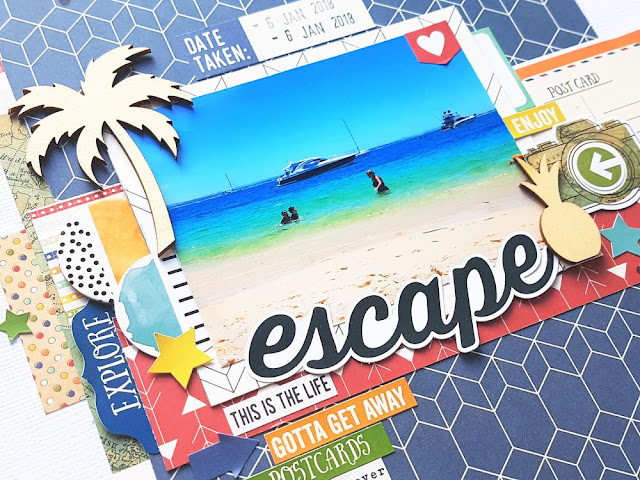 I used up the papers I still had by layering some vertically and some horizontally. I also sized one of the papers to use as a photo mat. I tucked lots of the stickers in and around my photo too. The palm tree and pineapple wood veneer pieces are so cute don't you think?