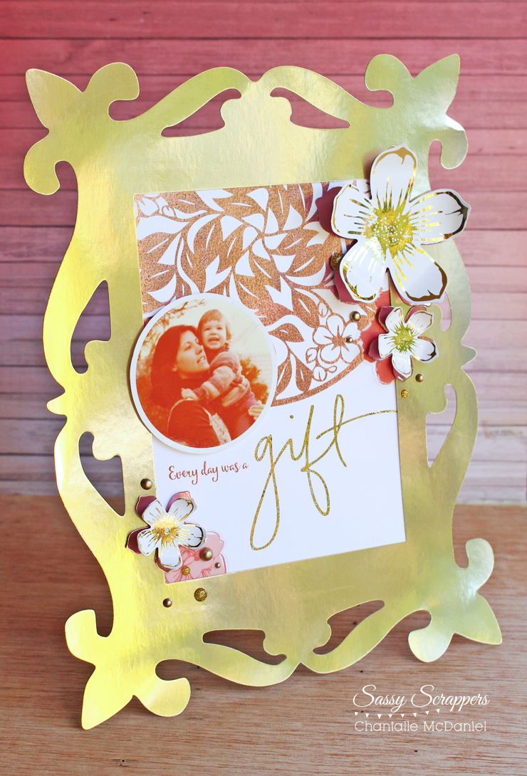 Today I want to share with you a framed project that I created using two of my very favourite crafting tools - my Cameo and my Minc. I scored this fab sheet of gold foil from another of my Daughter's craft packs (ssshhhh, don't tell her!) and I was thinking how cool it would be to make a little custom frame for my desk. This photo of my Mum and I is on my desk already, but on it's own it just wasn't special enough.