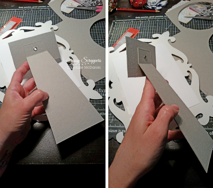 On the back of the frame, I have fashioned a support stand from chipboard which I measured by eye, and attached with an eyelet to a base, which I adhered to the back of my image. You'll notice I have scored a little line near the top of the stand so the angle at which the frame rests on a surface can be adjusted.