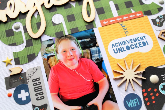 Once I had my title set out how I wanted it to look, I began to add my photo and some of the cute embellishments from the Bella Blvd Alex collection...there are lots of pieces that reference gaming and boys in this collection so they had to be included on this layout!
