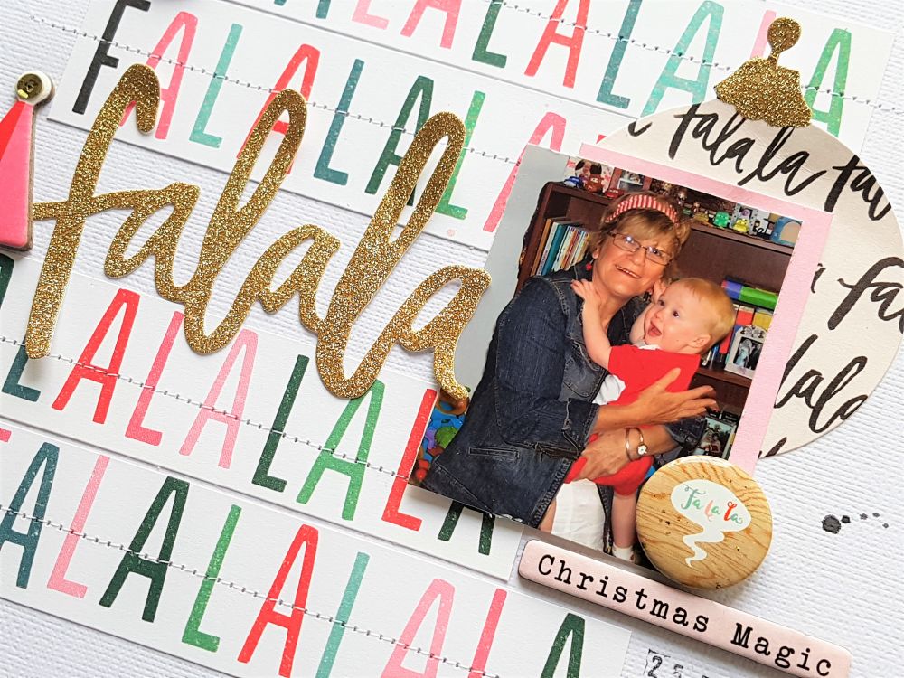 That gorgeous, gold, glitter die cut title makes a perfect title for this layout, I love how the font is different from the Fa La La in the paper...this helps it to stand out and pop off the page!