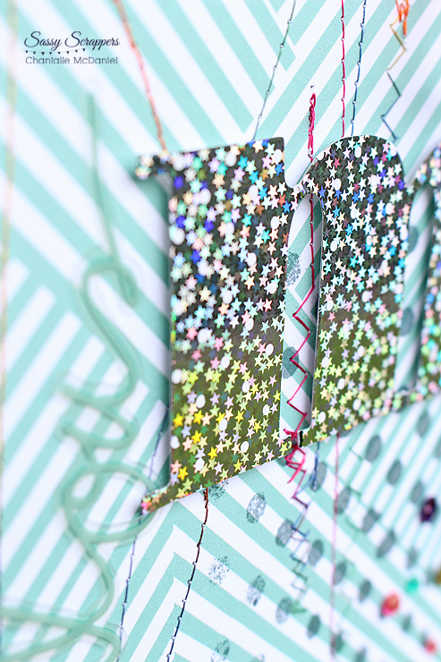 The large 'M' was foiled with some fun holographic foil I found at a hobby shop. I really love how smoothly the foil applies to the Heidi Swapp Minc accessories. The striped Wanderlust paper has been run with lots of messy machine stitching and multi-coloured thread. It's a fun touch to change up the stitch on your machine, from straight to zigzag. (Just be sure to lift the needle out of the paper before changing the settings!)