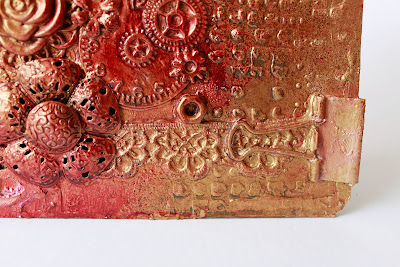 Step 8 and 9: Once you have dried your gold layer use Dylusion mists and start with your darkest colour (Brown) and mist the centre of your clusters and then the centre of the journal. Then dry with a heat gun it will make dull down and give you an older look to the gold. Then mist with your first bold colour (red) starting in the bottom LHS corner and also in the centre of the top RHS cluster.